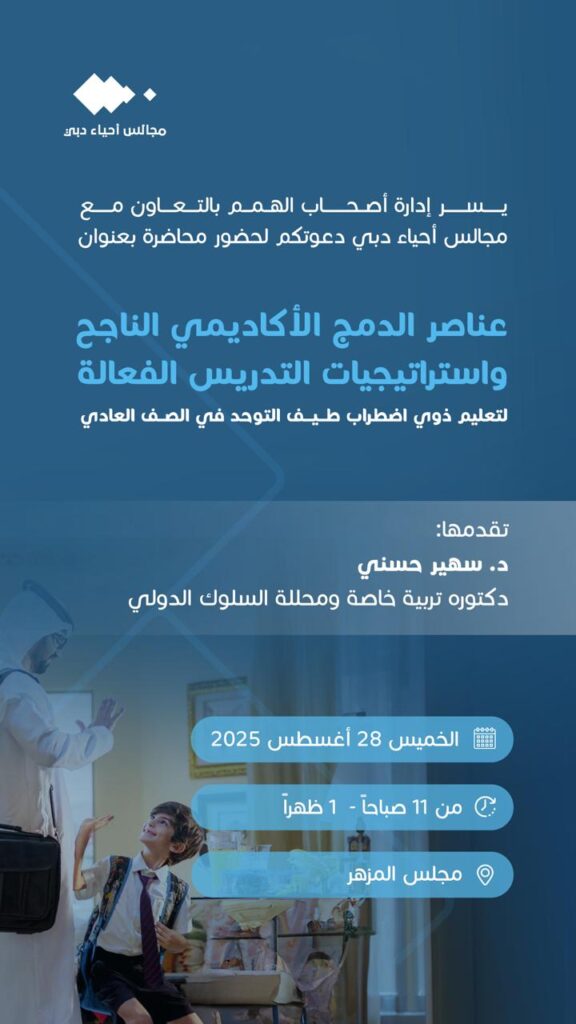 A lecture on the effective academic inclusion of students with Autism Spectrum Disorder in mainstream classrooms, in collaboration with the Community Development Authority in Dubai.August 2025